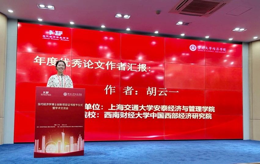 研究院胡云一博士获选2023年当代经济学博士创新项目